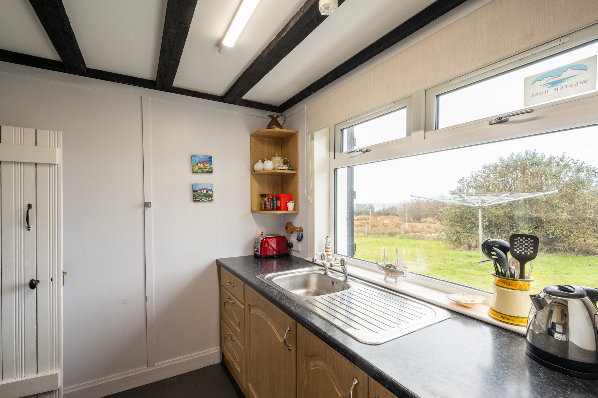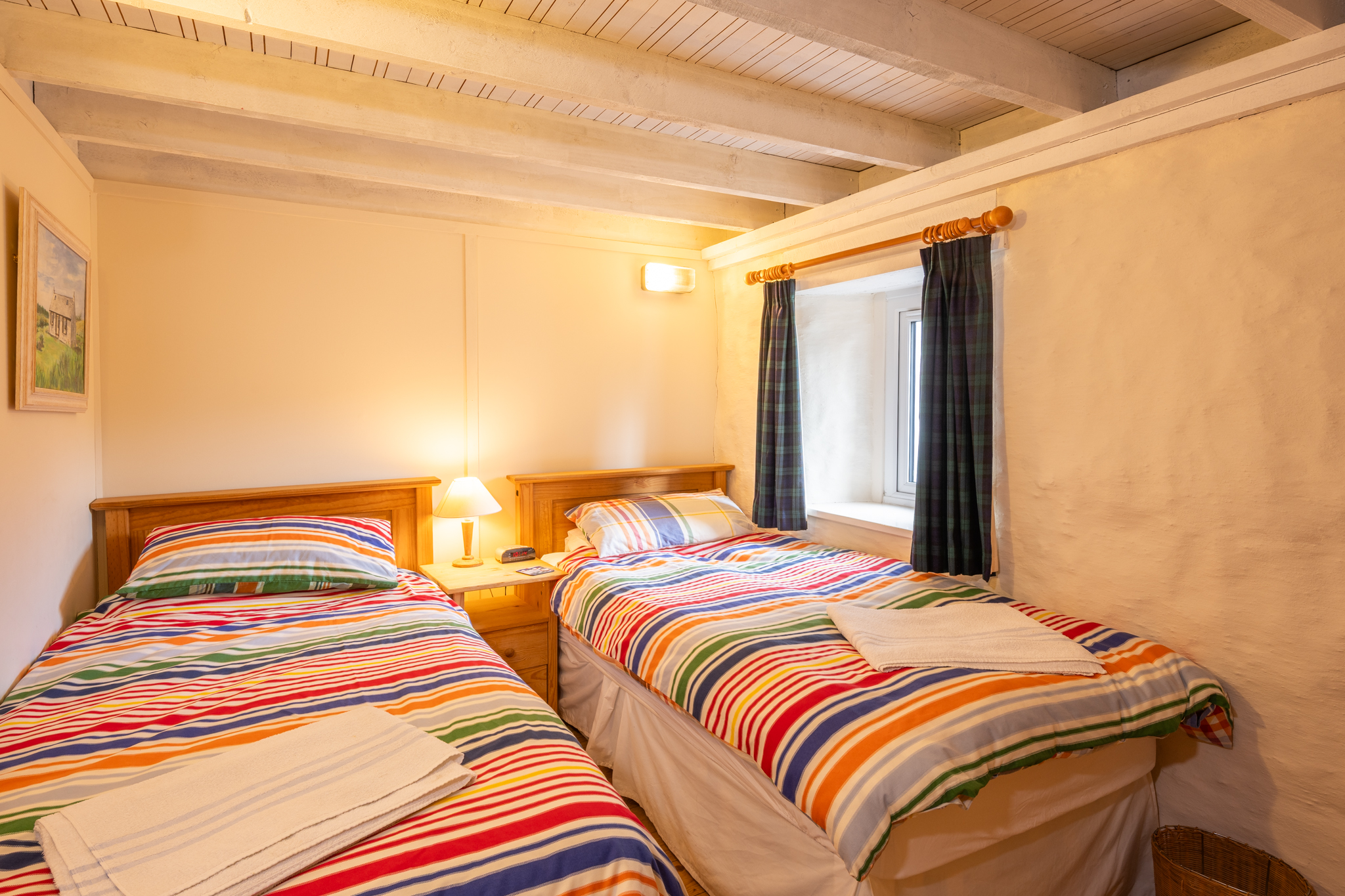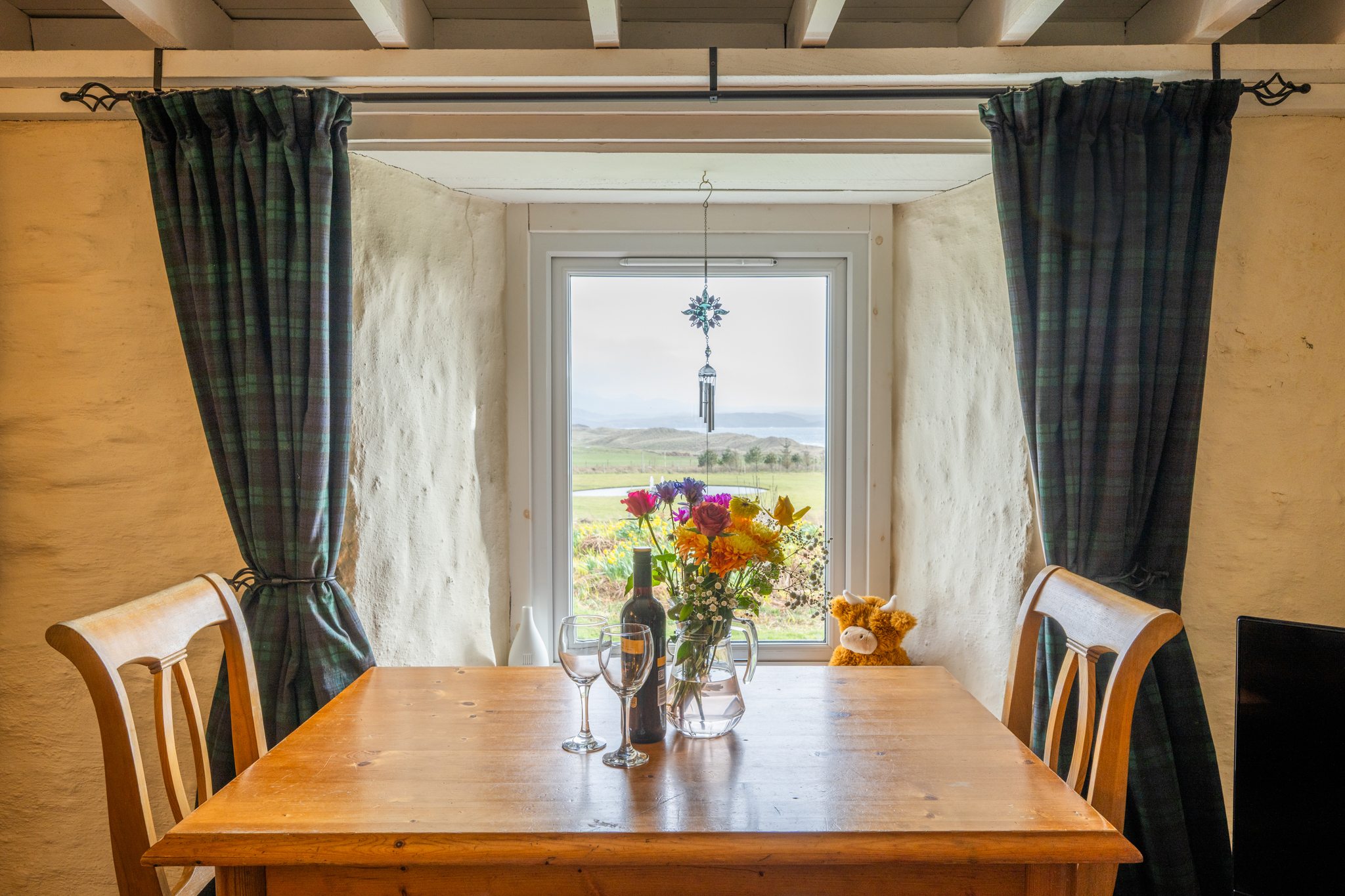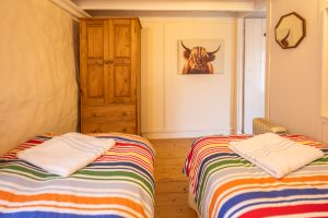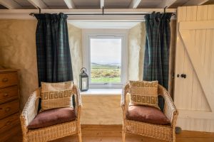 The Double Bedroom: a large bright room with breathtaking views over Big Sand Beach to the Torridon Mountain Range. The room is well furnished with two bedside cabinets, a clock/radio, a large wardrobe, chest of drawers, two wicker chairs, hairdryer and a multi-fuel stove.