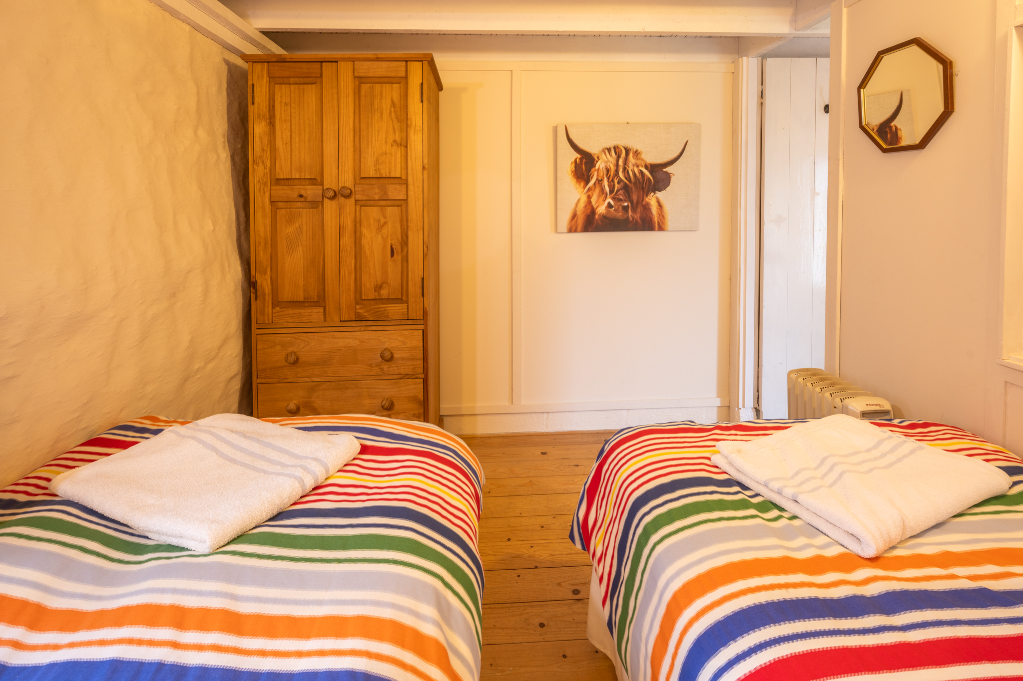 Twin Bedroom: This room contains 2 single beds, a bedside cabinet, a clock radio, a wardrobe with drawers and an electric radiator.