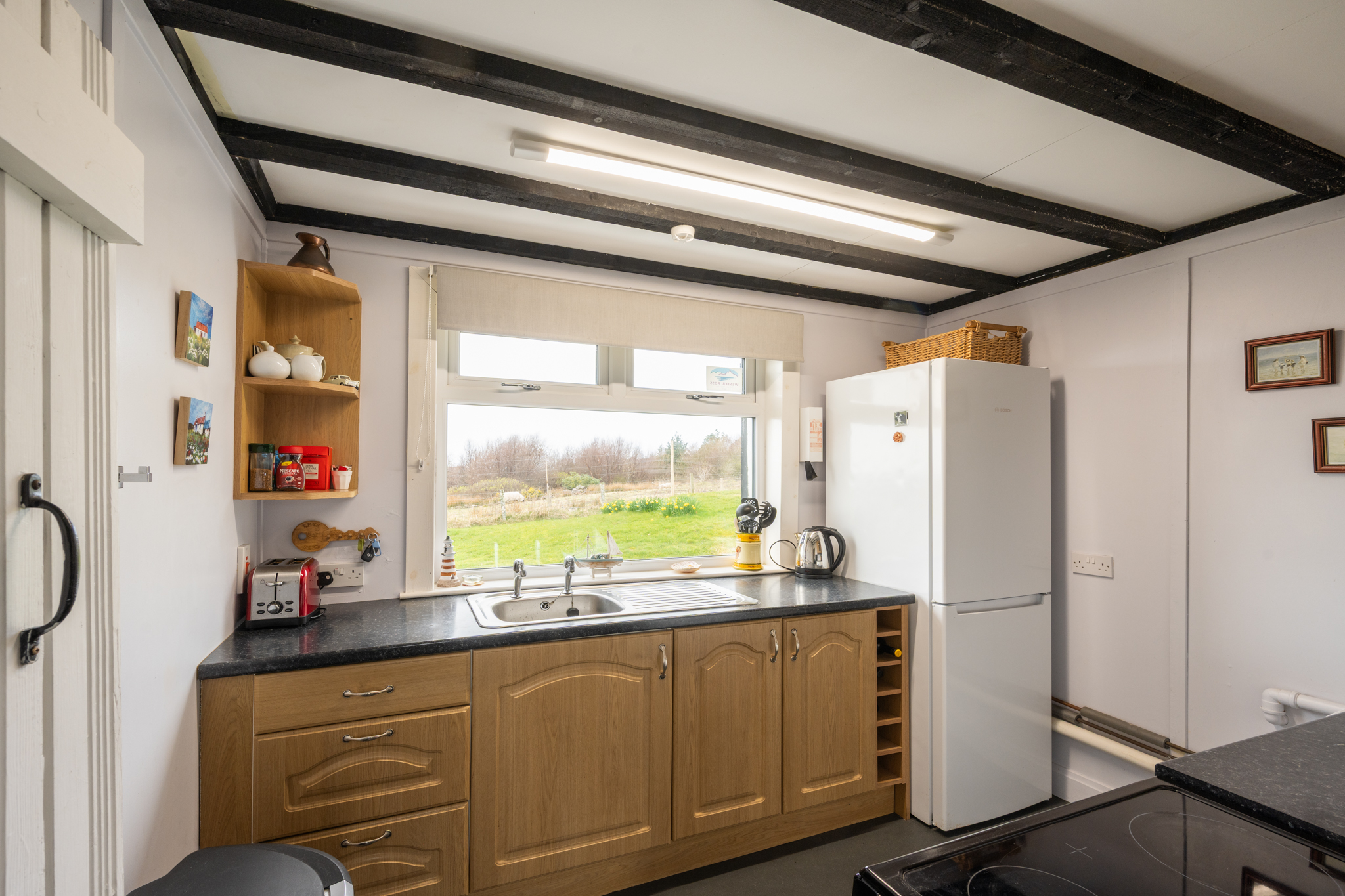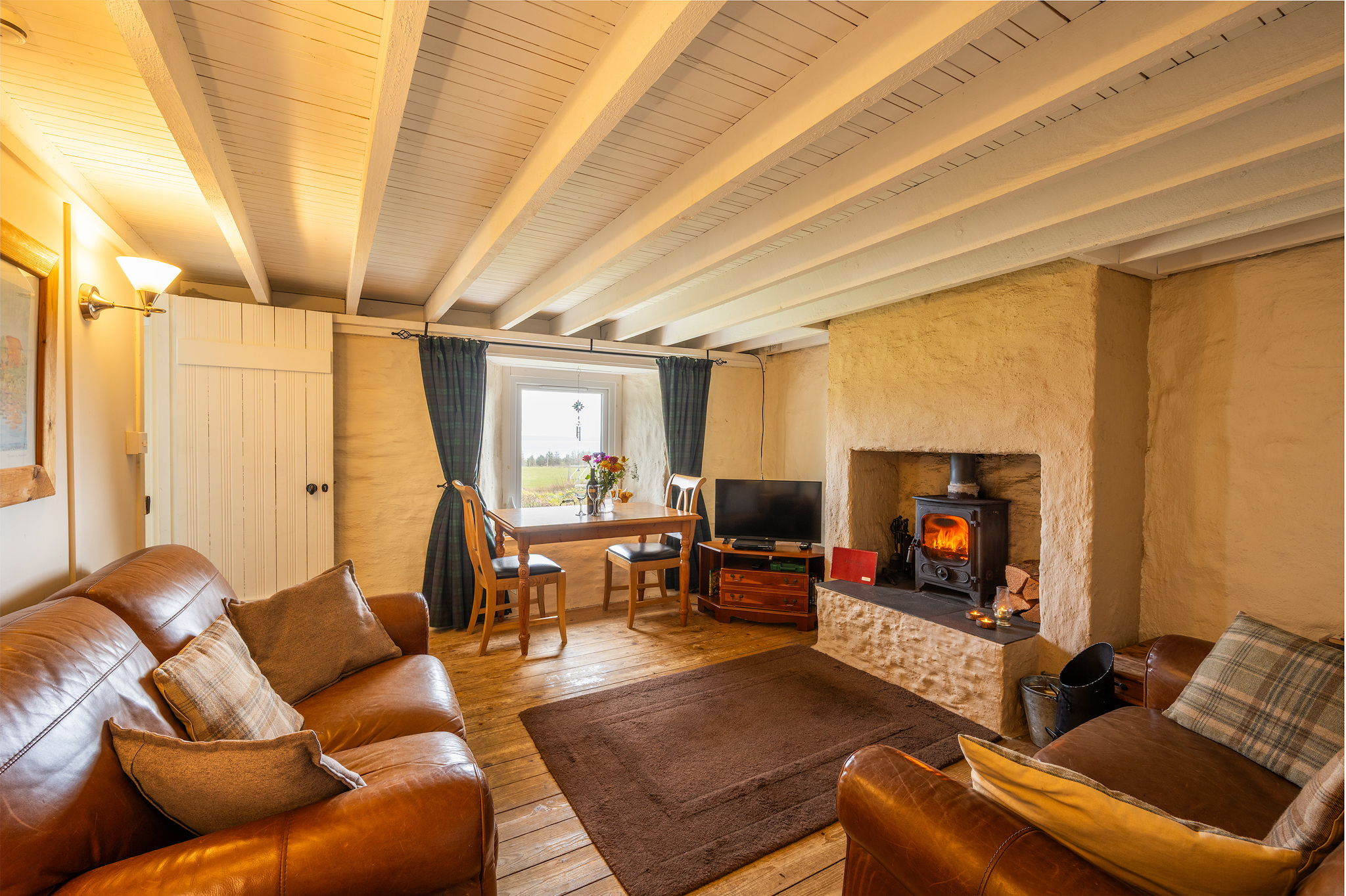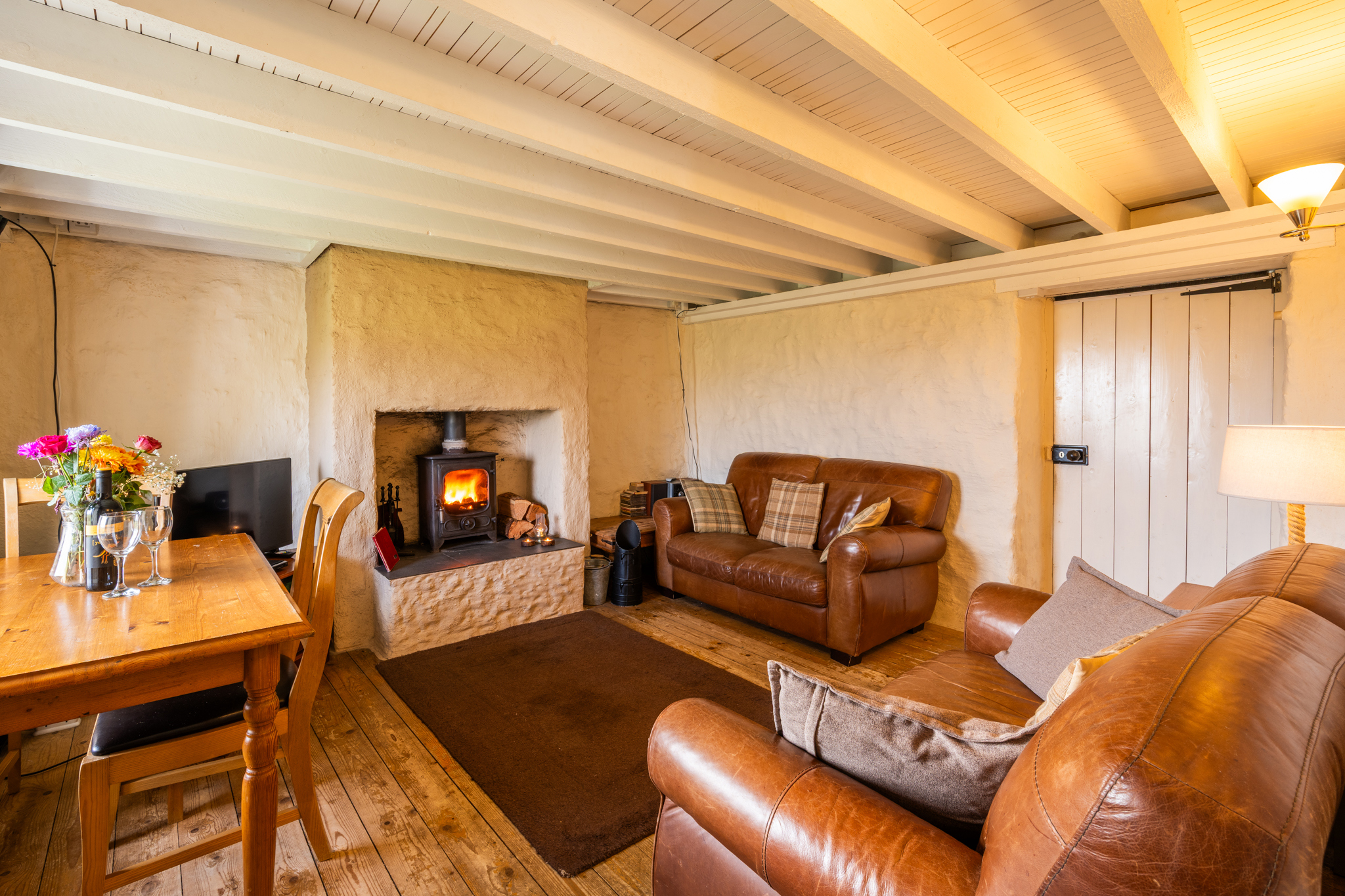 Lounge & Dining Room: A relaxing cosy room with free Fibre Broadband WIFI, a flat screen smart TV with DVD player, a mini Hi-Fi, two comfortable leather settees, a dining table and chairs and an effective multi-fuel stove. A travel cot, high chair and fire guard are also available for younger children.