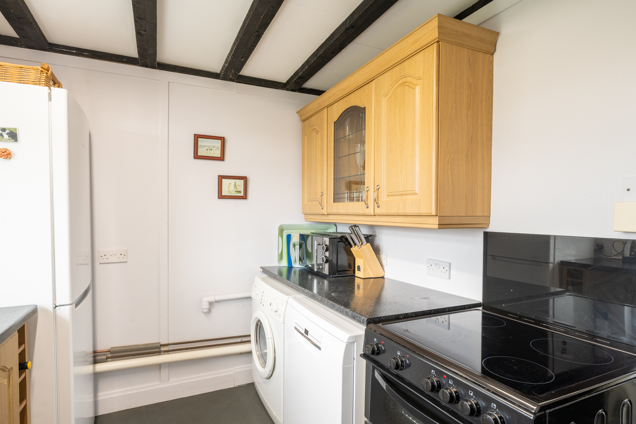 Kitchen: A modern fully fitted, well equipped kitchen containing a toaster, kettle, microwave, fridge freezer, washing machine, dish washer, electric cooker, picnic basket, wine rack and all necessary cutlery and crockery. In addition there is an iron and ironing board and washing basket provided for your convenience.