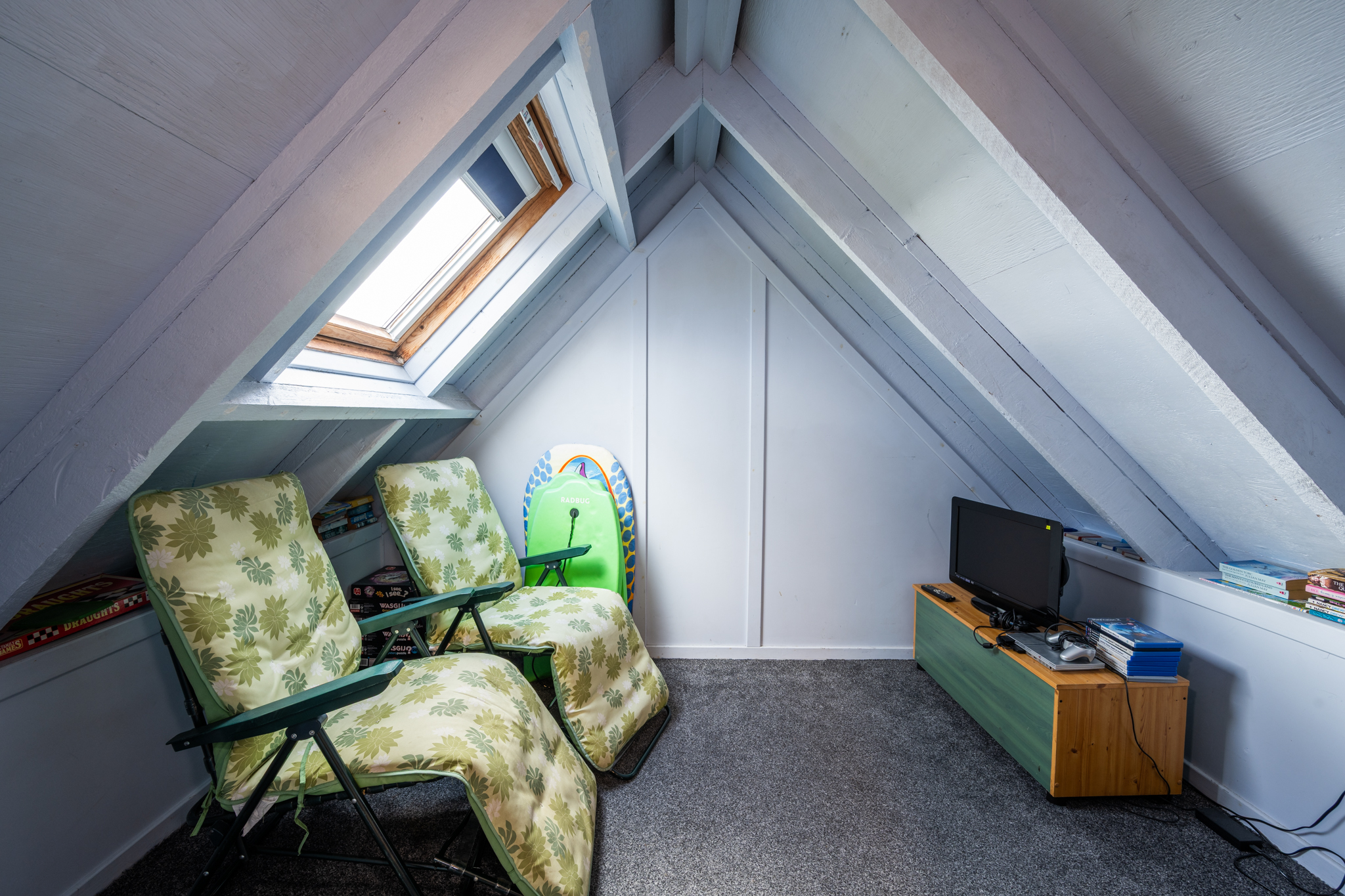 Attic Games Room: This room is accessed by a fixed wooden ladder and contains a Playstation 2 with several games, a collection of childrens and adults books, board games, jigsaws, kites and buckets & spades.